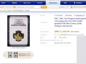ich schätze den 100 Yuan Pinguin so wie er hier angeboten wird auf 1000 Euro. Wurde vor einem halben Jahr für 1050 Euro bei Künker verkauft. Ich finde das Motiv sehr schön, jedoch scheint es beim Pinguin keine größere Nachfrage zu geben.