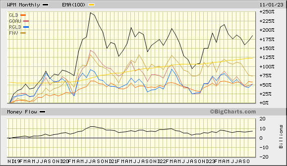 Getradet und m.E. momentan interessant; Ein 5J Chartvergleich der 3 großen Royalties vs dem GOAU von US Global -- in dem alle 3 enthalten sind -- und Gold im Anhang. FNV momentan bekanntlich angeschlagen, aber alle 3 deutlch über Gold sowie der 100 Monate EMA.