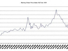 die erste findet sich in den 1830er jahren in england. objekt der begierde sind britische und deutsche eisenbahnaktien. der britische railway share price index stieg zwischen 1827 und 1836 von 100 auf 320 punkte, brach dann ein auf ca. 170 punkte um dann zu eine 'echobubble' anzusetzen, die ihn sogar auf ca. 420 punkte hoch trieb (um dann auf 150 abzustürzen) (bild im anhang). in so einer könnten wir uns aktuell befinden.