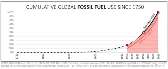 Das wird Sie umhauen: Schauen Sie sich den Chart aufmerksam an und Sie werden erkennen, dass die Hälfte aller fossilen Brennstoffe, die je in der Geschichte verbrannt worden sind, seit 1990 verbrannt wurden.