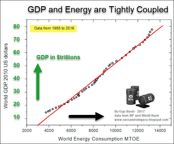 Er zeigt, dass das Wirtschaftswachstum (BIP) und der Anstieg der Energiegewinnung in den letzten 50 Jahren eng miteinander verknüpft waren.