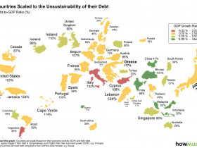 Anbei eine Karten-Graphik von "Visual Capitalist", die die Ländergröße in Relation der Verschuldungsrate anzeigt, sowie in verschiedenen Farben das Wirtschaftswachstum