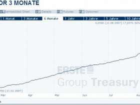 Seit der Entwicklung im August ist der EURIBOR extrem gestiegen und die Kurve hat einen bis jetzt ungebrochenen Knick nach oben gemacht. Dieses Verhalten ist eigentlich nicht mit der EZB Zinserwartung konform. Im August alleine (03.08 -22.08 ) hat der EURIBOR um fast 0,4% zugenommen.