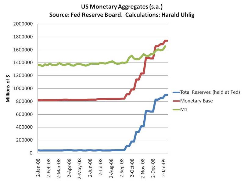 Wer hätte das gedacht, daß das passieren kann: die Geldbasis in den USA ist inzwischen größer als M1. Jetzt müssen wohl einige Textbücher umgeschrieben werden. Der Grund: die Einlagen der Geschäftsbanken bei der Federal Reserve Bank zählen zwar zur Basis, aber nicht zu M1.