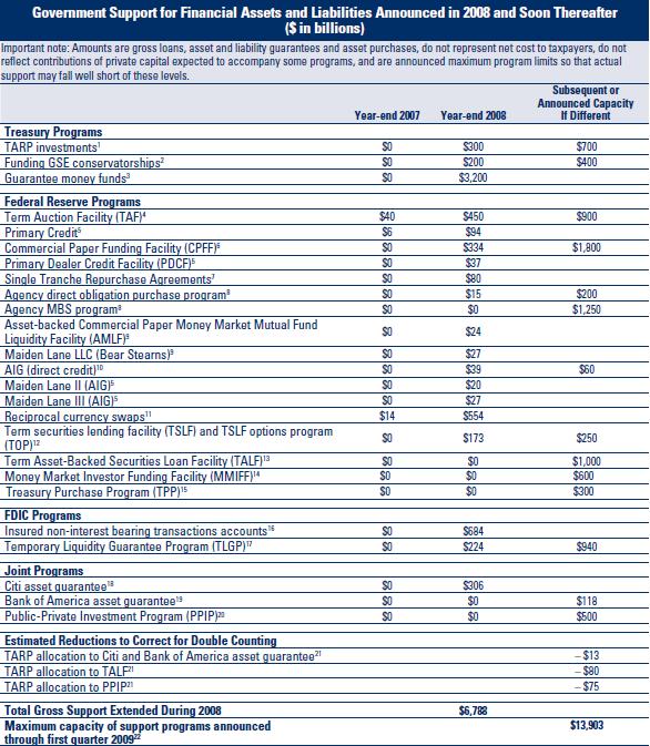 • Insgesamt fast 14 Billionen Dollar an angekündigten und bereits umgesetzten Liquiditätsprogrammen, Nothilfen, Konjunkturprogrammen und Kreditgarantien der FED, des US-Finanzministeriums, der US-Einlagensicherung FDIC und der Federal Housing Administration (FHA). Ende 2008 waren laut FDIC bereits 6,788 Billionen Dollar an Finanzhilfen in Anspruch genommen worden.