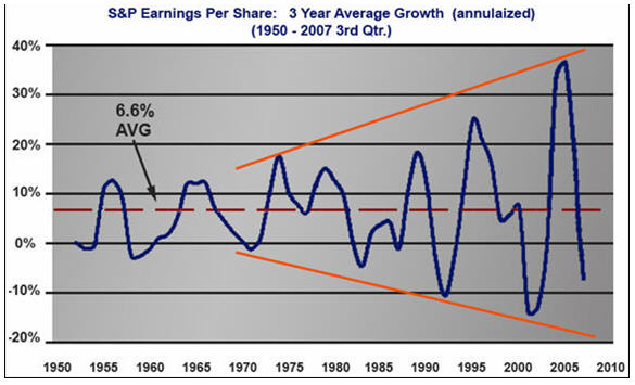 Einer der Charts, den ich seit Jahren verfolge, ist die Wolf-Wave (nicht zu verwechseln mit den Wolve-Waves von Brian Wolve) der Gewinne pro Aktie beim S&P. Dieser Zyklus bildet ein immer deutlicheres Megaphon-Muster aus. Das sollten sich all die angestellten Analysten, Prognostiker etc. mal in aller Ruhe in Bezug auf die Annahme einer Bodenbildung ansehen.