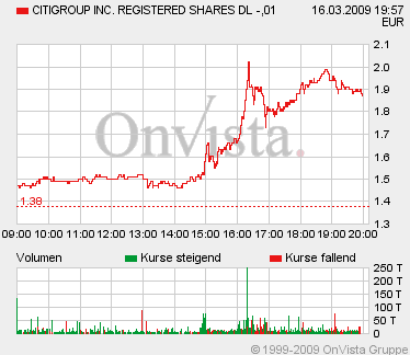 • Reich werden mit Citigroup & Co -- und zwar nach oben hin. Es bleibt dabei: alles eine Sache des richtigen Timings, der Rest ist Nebensache. Wen interessiert schon, ob die Aktienmärkte ihre Tiefs ausgebildet haben, wenn man einfach den kurzfristigen psychologischen Stimmungen folgen müsste, die sich um die Bankwerte gebildet haben, um dann mit einer zerrupften Bank of America ganz ohne Hebel 80% in einer einzigen Woche einzufahren. Oder: seit etlichen Tagen ist bekannt, dass die Deutsche Bank Abermillarden von AIG überwiesen bekommen hat. Und heute, da es nun endlich gross und offiziell in allen Zeitungen steht, geht es eben dann nochmals nach oben. Auf die Woche gesehen kommen so bei der DeuBa 40% zusammen. Und dann hau weg den Scheiss...Bodenbildung hin oder her.