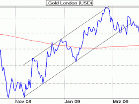 Gold notiert noch oberhalb seiner 200-Tage-Linie, doch der im Oktober 2008 begonnene Aufwärtstrend wurde vor wenigen Tagen gebrochen. Damit wird es spannend: Schafft das Edelmetall die Rückkehr in den Aufwärtstrend, bedeutet dies, dass der Markt bessere Chancen für eine gelingende Inflationierung sieht. Bricht Gold hingegen weiter ein, könnte dies für ein eher deflationäres Szenario sprechen.