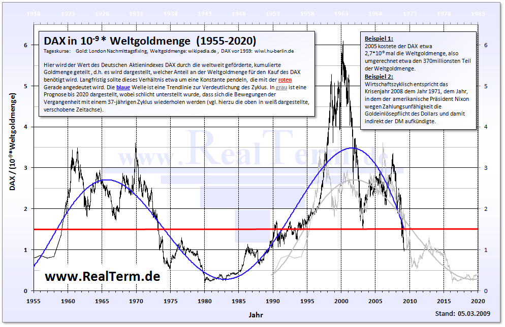 ja, zu 2) hast Du schon recht, dann eben präziser ausgedrückt: Ausgehend von einem demnächst zu markierenden "Hoch" sagen wir mal bei Dax max. 6.000 Pt und beim DOW 9.000 Pt. (wenn überhaupt so viel) gehe ich davon aus, spätestens im Herbst/Winter 09 Stände von knapp 3.000 bzw. um die 5.000 beim Dow.