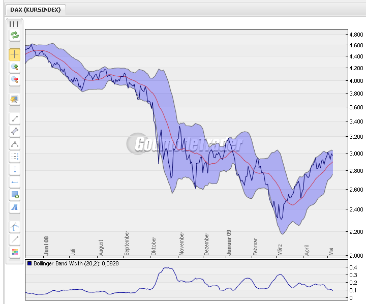 Und Kursindex-Bollinger Bänder werden enger - bald gibt es eine Änderung...