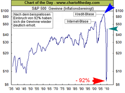 Das folgende Schaubild zeigt die Dynamik der Gewinnentwicklung beim S&P 500 Index. Nach dem vorangegangenen völligen Einbruch von 92% (roter Pfeil)- so etwas hat es in der Börsengeschichte noch nie gegeben - sind die Gewinne bisher um 600% (grüner Pfeil) wieder gestiegen. Gewinnschätzungen für dieses Jahr liegen zwischen $65 und $89 beim S&P 500! Die Kreditblase war auf ihrem Höhepunkt (blauer Pfeil), als die Gewinne 2007 die $90-Marke erreichten.