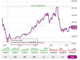 Seit dem Top vor 2 Jahren sind wir ja auch nochmal deutlich gefallen - das kannst Du dann extrapolieren.Woernie sprach vom Niedergang der Immobilien. Das ist natürlich Unsinn. Sie stiegen schneller und vor dem Gold, das jetzt nun folgt.