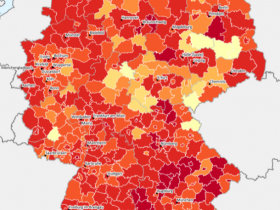 Die Mieten und Kaufpreise ("Vervielfältiger") wachsen in 318 Landkreisen und kreisfreien Städten nicht mehr im Gleichklang (Vorquartal 311, vor drei Jahren 236). In 345 Kreisen sind die Kaufpreise den Einkommen ("Preis-Einkommen") enteilt – im Vorquartal waren es 338, vor drei Jahren 252. Und in 64 Kreisen werden aktuell "zu viele" Wohnungen gebaut, im Vorquartal waren es ebenfalls 64, vor drei Jahren 32.
