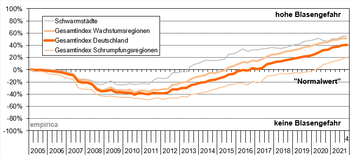 ... unabhängig davon wie die Zahlen und Werte zusammen geschüttelt und ins Verhältnis gesetzt wurden finde ich eine Information bemerkenswert: Der Graph für die Schrumpfungsregionen schwankt natürlich im Gleichklang mit den anderen, aber Mitte 2020 hat er die von Empirica definierte Normallinie von unten nach oben durchbrochen. D.h. grob gesagt: Laut der Definition und Rechnungsmethoden von Empirica sind nun selbst die Schrumpfungsregionen im Blasenmodus.