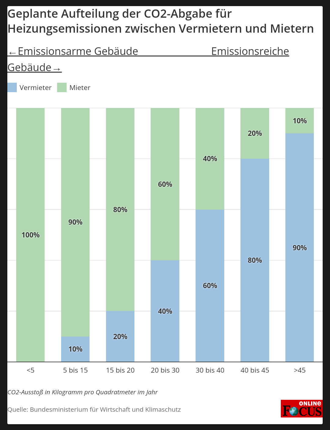 Als aufgeklärter und den grundrechenartenfähiger Mieter kann ich mir anhand der Heizkostenabrechnung selbst ausrechnen, ob es sich nicht ggf. finanziell auf Mieterseite lohnt, nochmal ordentlich hochzuheizen, damit der CO2-Verbrauch pro Quadratmeter die nächste Stufe erreicht und der Vermieter einen höheren prozentualen Anteil an den Kosten trägt.