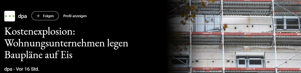 sicherlich gibt es noch einen Nachlauf, aber die Neuaufträge bleiben aus. Beim Preis von 3.100,00/m² Wfl. ist noch eine Realisierung möglich, aber eben einfacher Standard. Da hat der Bauträger vielleicht noch 300-400 EUR/m² übrig. Allerdings stellt die mangende Verfügbarkeit zahlreicher Baustoffe bzgl. der Bauzeit ein unkalkulierbares Risiko dar. Durch den kräftigen Zinsanstieg wird auch der eine oder andere Kaufinteressent aussteigen. Mitte nächsten Jahres werden wir uns das ganze Gejammer anhören müssen, aber es gibt ja zum Glück schon einen Schuldigen: Putin war es.