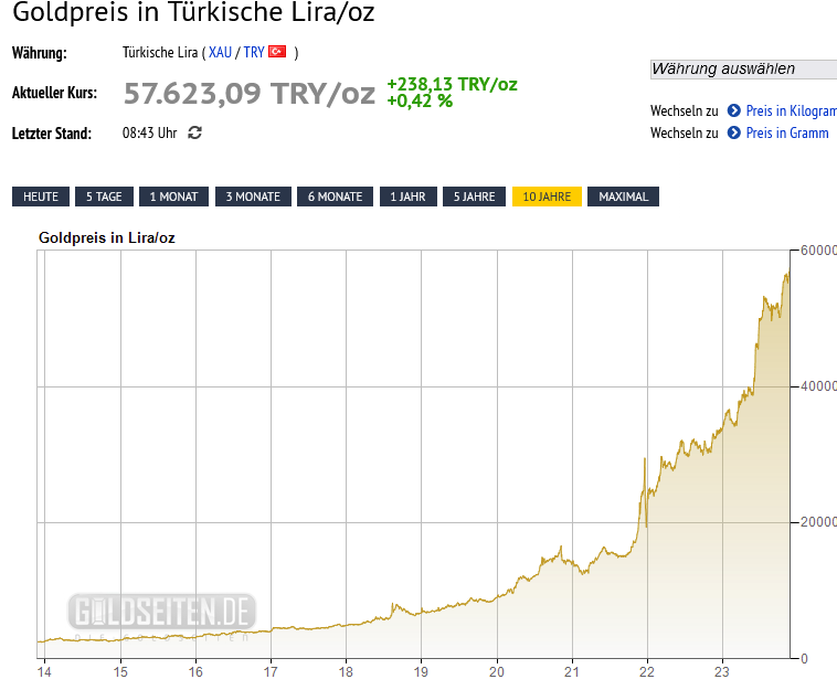 Gold war in türkische Lira in 2015 bei ungefähr 3100 Lira, nun bei 57.600 Lira. Gold ist also um den Faktor 18,5 teurer geworden. Wer ist nun besser gefahren?