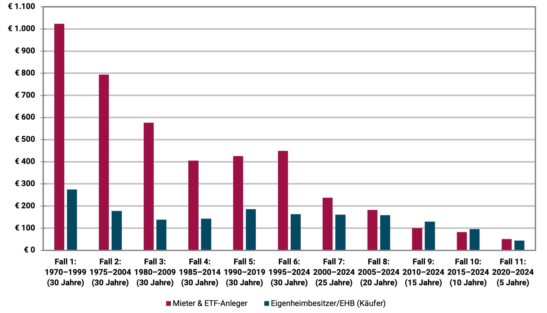 Abbildung: Vergleich des Endvermögens von Eigenheimbesitzer/Käufer versus Mieter/ETF-Anleger in 11 unterschiedlichen Zeitfenstern zwischen 1970 und 2024 (55 Jahre)