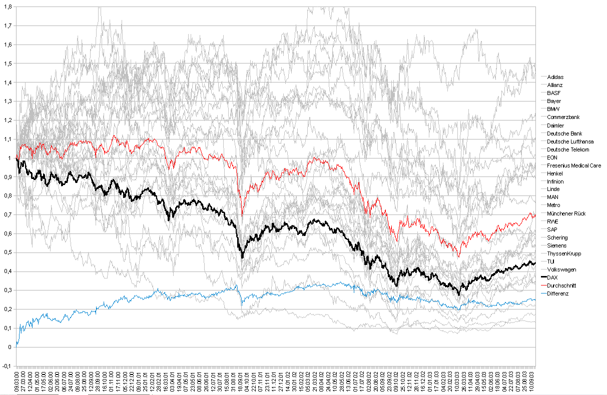 Dazu wurde jede Aktie auf dem DAX-Höchststand auf 1 gesetzt und die Entwicklung der Kurse entsprechend umgerechnet. Dann wird von allen Aktien der Durchschnitt errechnet (rote linie). Die Differenz zum DAX ist die blaue Linie unten.