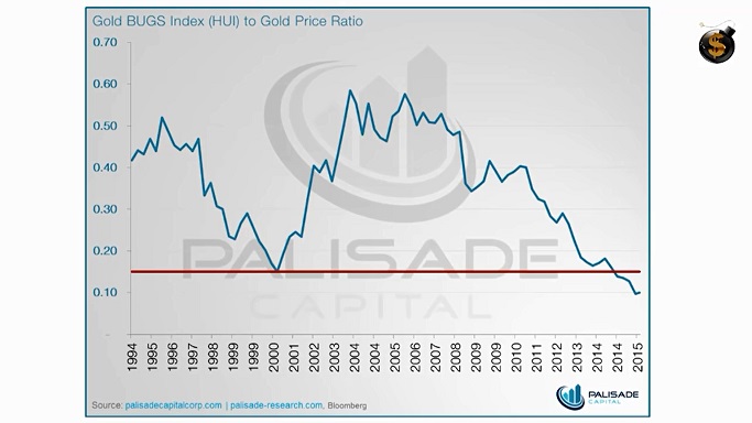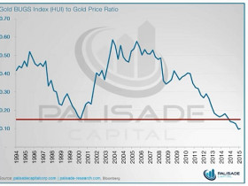 - Verhältnis des HUI Gold Bugs Index zum Goldpreis zuletzt im Jahr 2000 so niedrig wie heute.