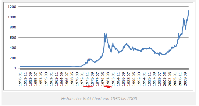 Der Goldpreis stieg von Januar bis Oktober 1979 von etwa $227 auf über $390, was einem Anstieg von ungefähr 70 % entspricht. Im Vergleich dieses Jahr in der Spitze ca. 55 %.