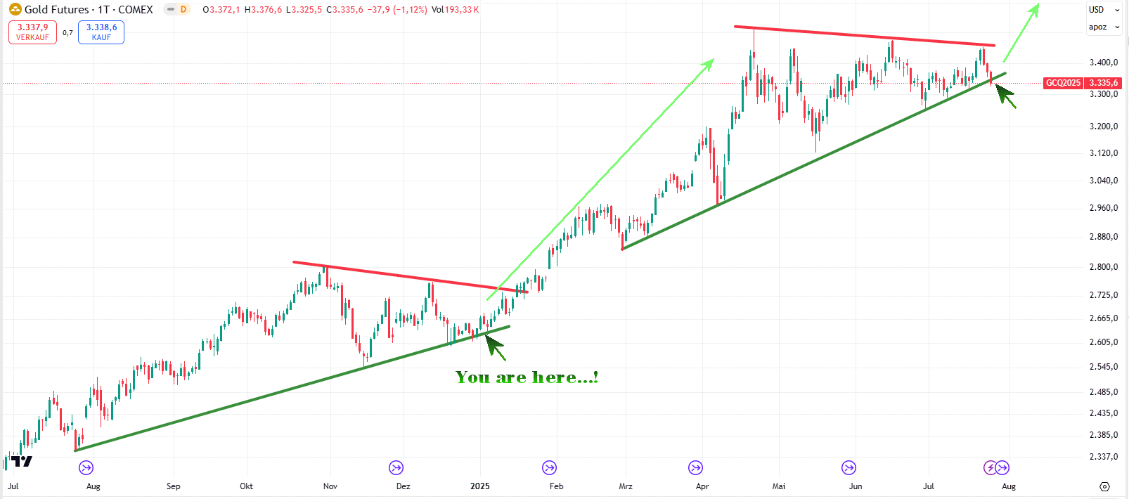 Der Aufwärtstrend ist mehrfach getestet und zuletzt auch deutlich verletzt worden. Das Timing mit der Zolleinigung passt mal wieder wie die Faust aufs Auge. Gut informierte Kreise haben bereits am Freitag verkauft, was das Zeug hält. Morgen gibt's 'nen Rutsch, der sich gewaschen hat und von dem sich Gold nicht so schnell erholen wird.