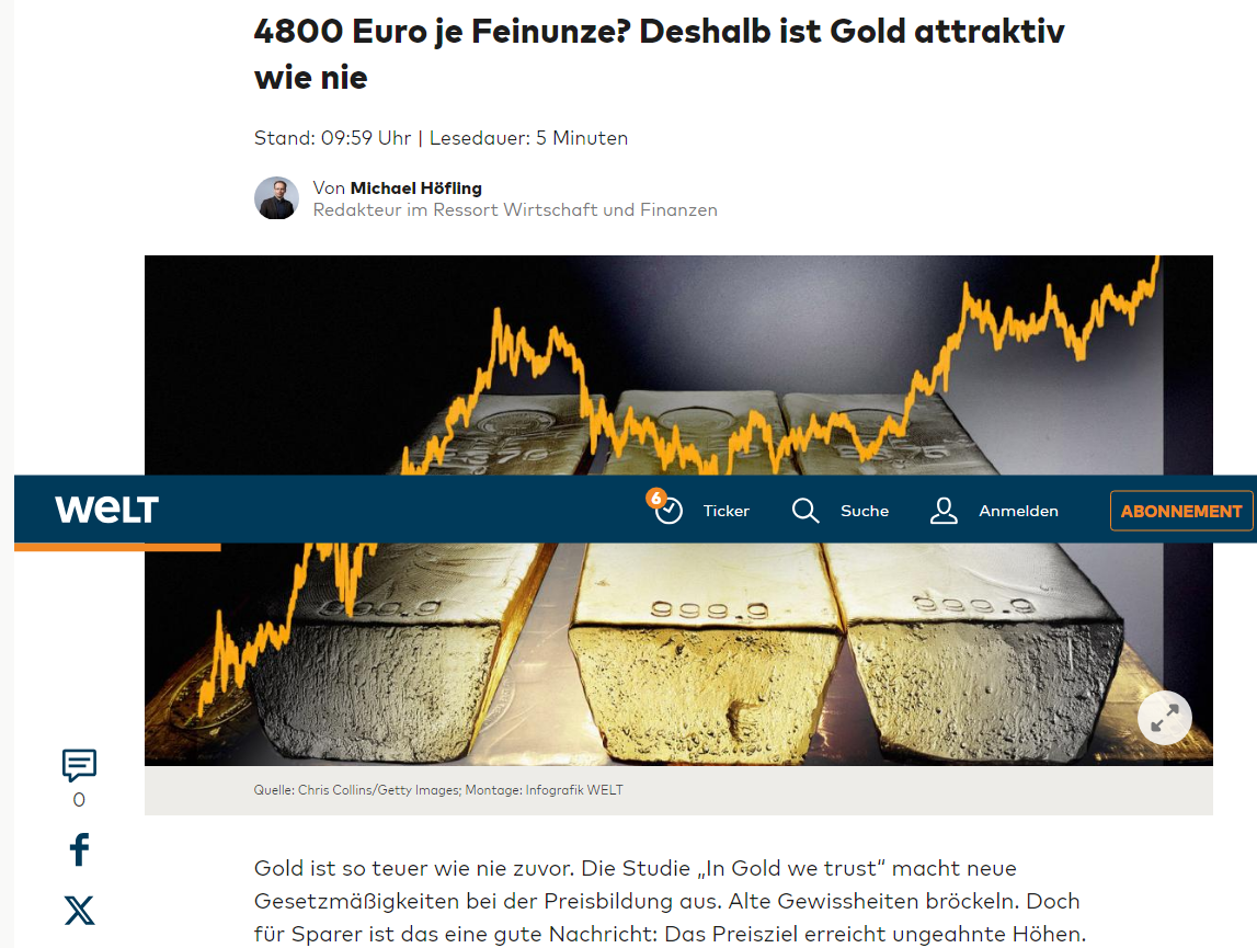 Ist zwar nicht die BILD sondern Welt, aber trotzdem aus dem Hause Springer. Der Artikel hinter der Bezahlschranke befasst sich mit Ronald Stöferles "in gold we trust" Studie. Ob das ein gutes Omen ist? Zum Glück verkaufen die Chinesen und andere aufstrebende Volkswirtschaften ihre US-Dollars um Gold zu erwerben. Von da kommt der überfällige Anstieg. Kann aber nicht schaden, wenn auch deutsche Vermögende verstärkt in Gold umschichten.