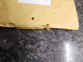 Einige Tage später lag das Päckchen dann in meinem Briefkasten. Das ganze kam mir gleich sehr leicht vor. Und tatsächlich war die Versandtasche fein säuberlich oben aufgeschnitten und die Münze aus dem Päckchen wurde daraus gestohlen.