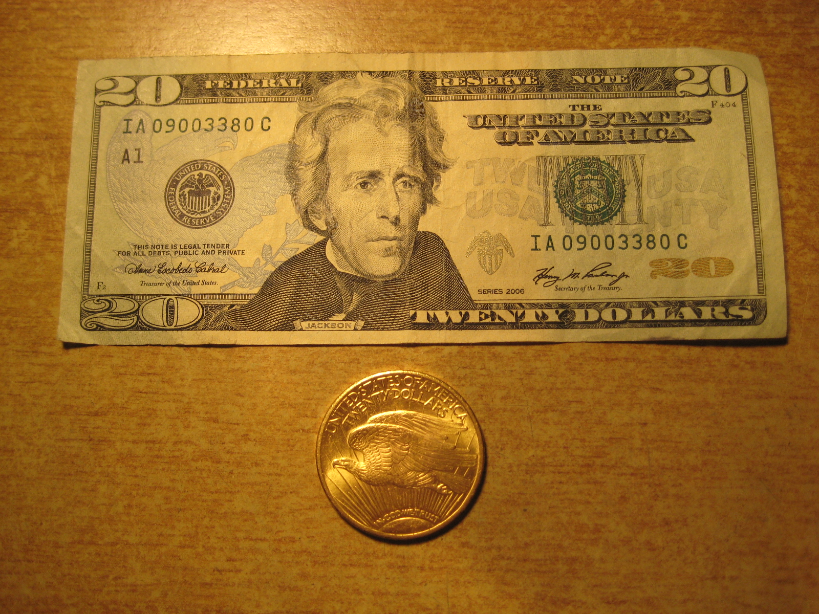 Die Auswirkungen mal anschaulich: 20 (Gold)Dollar von 1924, 20 (Papier)Dollar von 2006. 1924 betrug der Preis von 30,09g Gold 20 Dollar, heute repräsentieren 20 Dollar gerade einmal 0,5g Gold. Das Gewicht der Goldmünze hat sich nicht geändert, der Wert des Geldscheins (ehemals Banknote, der einen Gegenwert in Gold repräsentierte, heute nur noch "in god we trust"= Vertrauen gedeckt) inflationiert über die Zeit. Welches Maß ist verläßlicher? ![]()