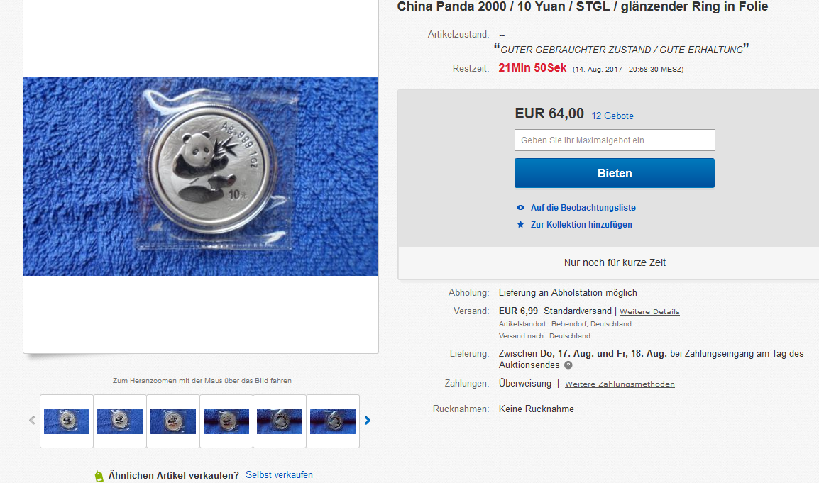 Hallo,biete an: Pandas 2017 1g im 10er Sheet 1x und Panda 2016 1g 5 einzelne im org. Plastik.nur Komplettverkauf 15 Pandas Preis: 640 €zzgl Versand via UPS 6 €