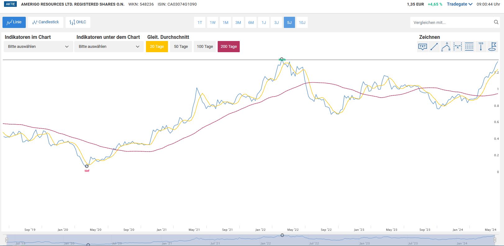 Zitat hieraus:"Amerigo Resources hat es etwas besser gemacht. Das Unternehmen produziert Kupfer aus dem Abfallmaterial der riesigen Untertagemine El Teniente des chilenischen Bergbauunternehmens Codelco. (El Teniente begann 1905 mit der Produktion und hat eine prognostizierte Lebensdauer bis 2082, so dass wir uns keine Sorgen machen müssen, dass das Kupfer ausgeht). Amerigo hat einen Marktwert von 290 Mio. CAD und zahlt eine jährliche Rendite von fast 7%.