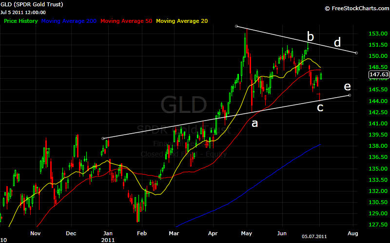GLD könnte während dem Sommer ein Dreieck ausbilden, um dann so im August rum nach oben auszubrechen. Unten 2 Charts. Den ersten habe ich vor ein paar Tagen gemacht, da sieht man, dass diese C-Welle noch etwas Luft nach unten hat. Beim 2. Chart ist der Boden der C-Welle bereits drin, das würde bedeuten, dass Gold die nächsten Monate nicht mehr billiger als aktuell sein wird.