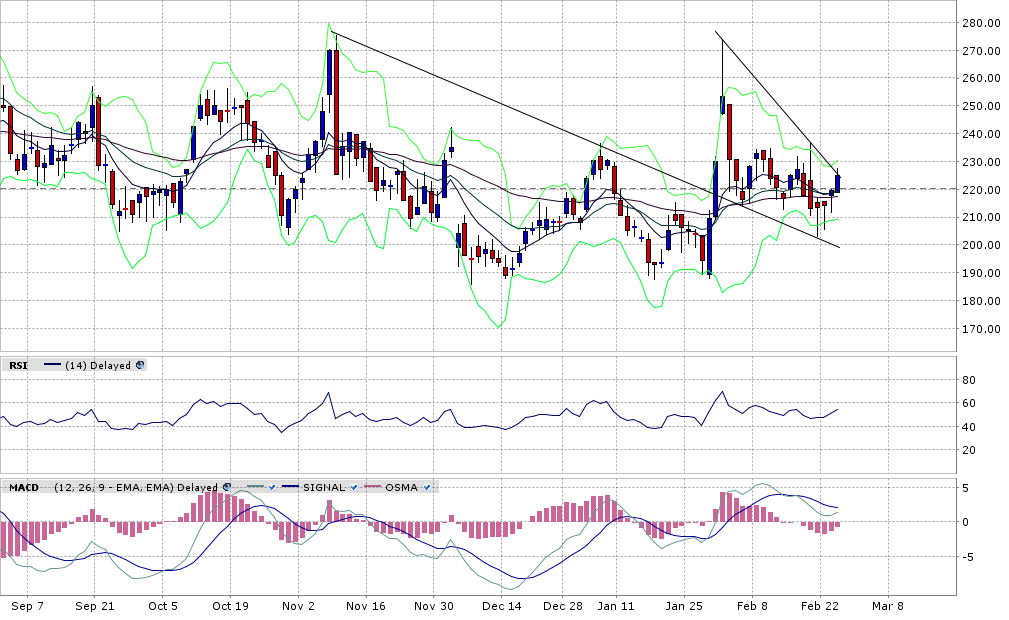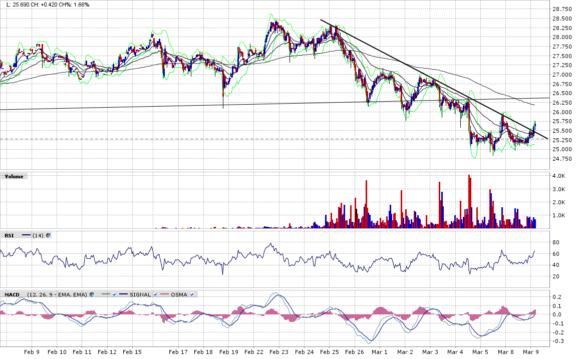 Noch ist der Abwärtstrend nicht vorbei. Der 9 MA, der seit Januar der Wegbegleiter nach unten war, wurde heute zwar knapp überwunden, aber noch nicht signifikant. Der 20 MA sollte auch noch genommen werden, bis man von dieser Seite eine Durchbrechung des Musters erkennen kann.