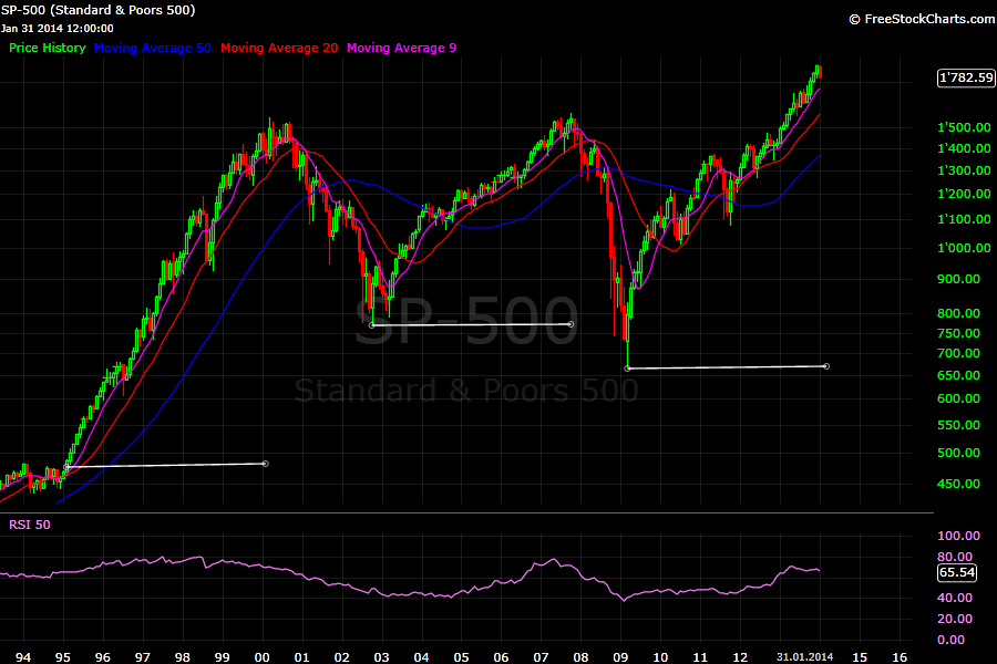 Wie weiter jetzt? Wenn ich von Aktienmarkttop 2000 zurückgehe fällt auf, dass 1994 Aktien nach laaangem Aufwärtstrend 1 Jahr konsolidierten und dann zu Beginn 1995 in ihre letzte Phase eintraten.... Der Aufwärtstrend wurde beschleunigt, eine typische Übertreibung oder Fahnenstange. Es dauerte dann rund 5 Jahre bis zum Top. Nach der 2-jährigen Korrektur kam eine erneut exakt gleich lange rund 5-jährige bullische Phase bis zum 2007 Top. Nach der 2 jährigen Korrektur startete dann eine neu bullische Phase und ich habe eingezeichnet, wann diese Phase die Länge der vorhergehenden beiden bullischen Phasen erreicht hat.....