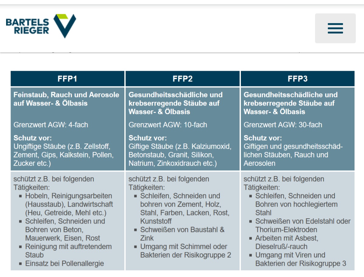 Eingesetzt werden bei den Feinstaubmasken Halbmasken und Vollmasken. Diese halten Partikel zuverlässig ab und schützen die Atemwege vor den gefährlichen Aerosolen und Stäuben am Arbeitsplatz. Auch schützen FFP-Masken ab der Schutzklasse 3 zuverlässig vor Viren, wie beispielsweise den Corona (wie z. B. COVID-19) oder den Influenza-Viren.