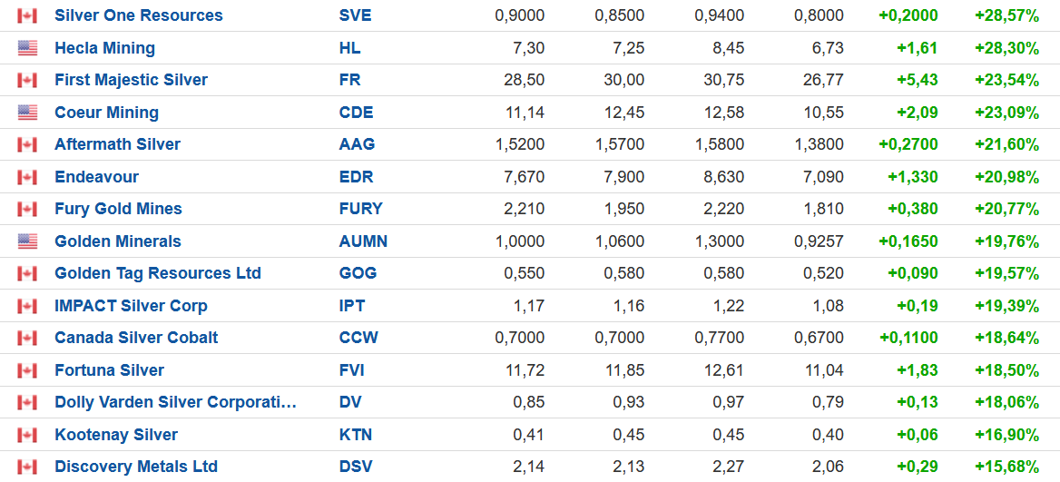 Ich bin mittlerweils zu 75 % in Silberminen investiert. An einem Tag wie diesem spürt man den Schub im Depot brachial. 25 Werte meines Depots lieferten zweistellig. In den vordersten Rängen standen die gut bekannten Schwergewichte.