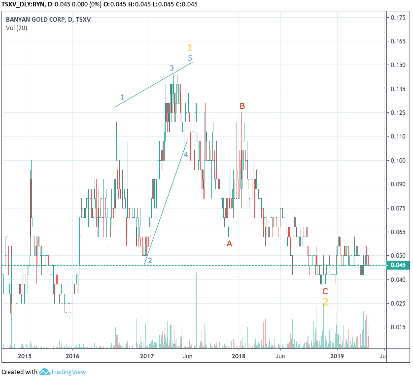 Vom Chart her liegt wohl eine perfekte a=c Struktur mit dem Tief bei 0,035 C$ vor. Zuvor gab es m.E. ein Leading Diagonal Triangle im großen Anstieg.