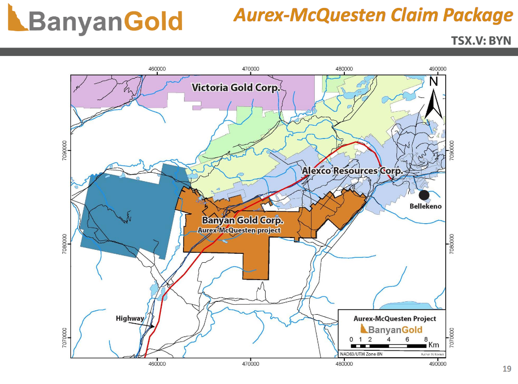 Banyan Gold (BYN) hat wie Metallic Minerals (MMG) ebenfalls ein Projekt (Aurex McQueston Project), welches direkt an Alexco Resource´s Keno Hill Project sowie an Victoria Gold´s Eagle Gold Project (VIT) angrenzt.