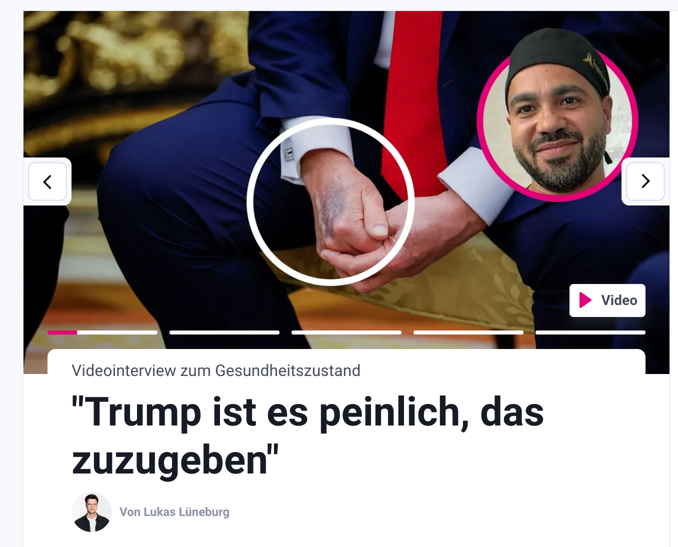 "Ihm ist es peinlich, das zuzugeben": Gefäßchirurg analysiert Trumps GesundheitAktuelle Aufnahmen von Trumps blauen Flecken auf dem Handrücken lassen die Spekulationen hochkochen. Der Facharzt für Gefäßchirurgie Dr. Abbas Kodeih…www.t-online.de -