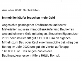 "Angesichts gestiegener Kreditzinsen und teurer Materialien müssen Immobilienkäufer und Bauherren wesentlich mehr Geld mitbringen..."
