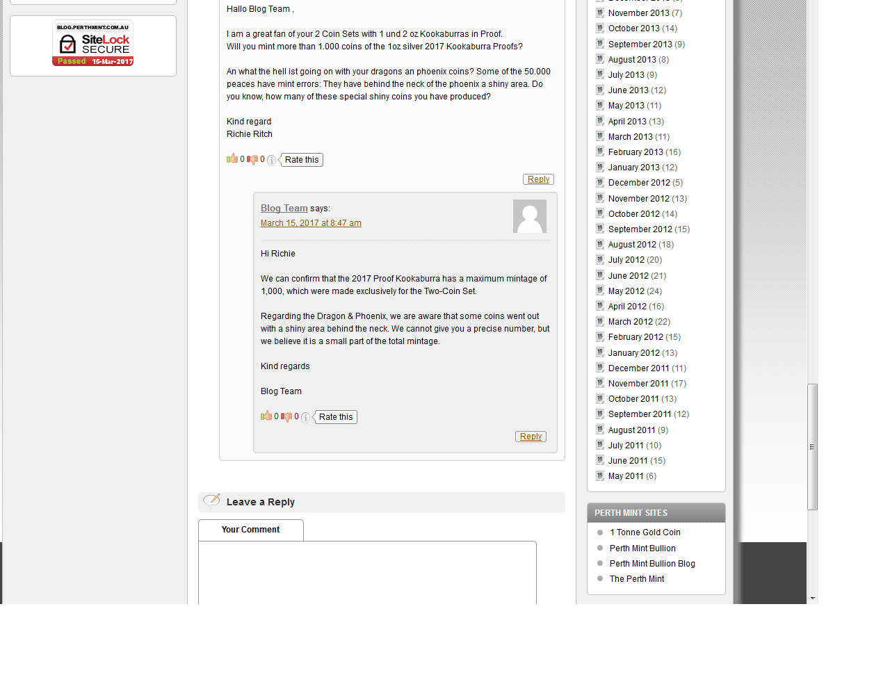 Die 1oz Dragon and Phoenix 2017 steht in der langen Tradition der Perth Mint Drachen. Sie ist anders als der Lunar II Drachen nicht auf 300.000 Stücke sondern auf 50.000 Stücke limitiert. Hinzu kommt eben, dass die Perth auf meine Nachfrage behauptet hat, dass es sich nur um eine "kleine Charge" von Fehlprägungen handelt.