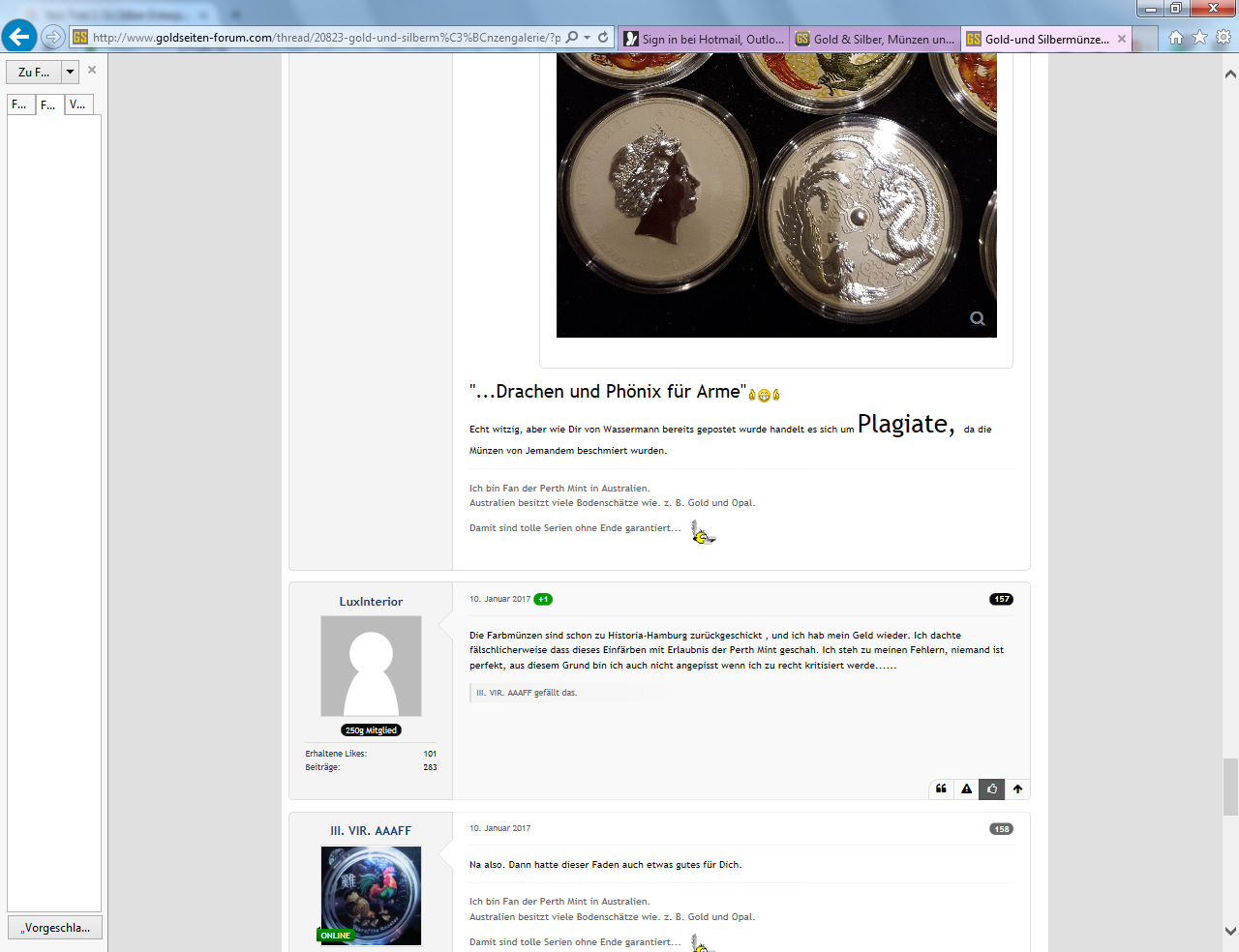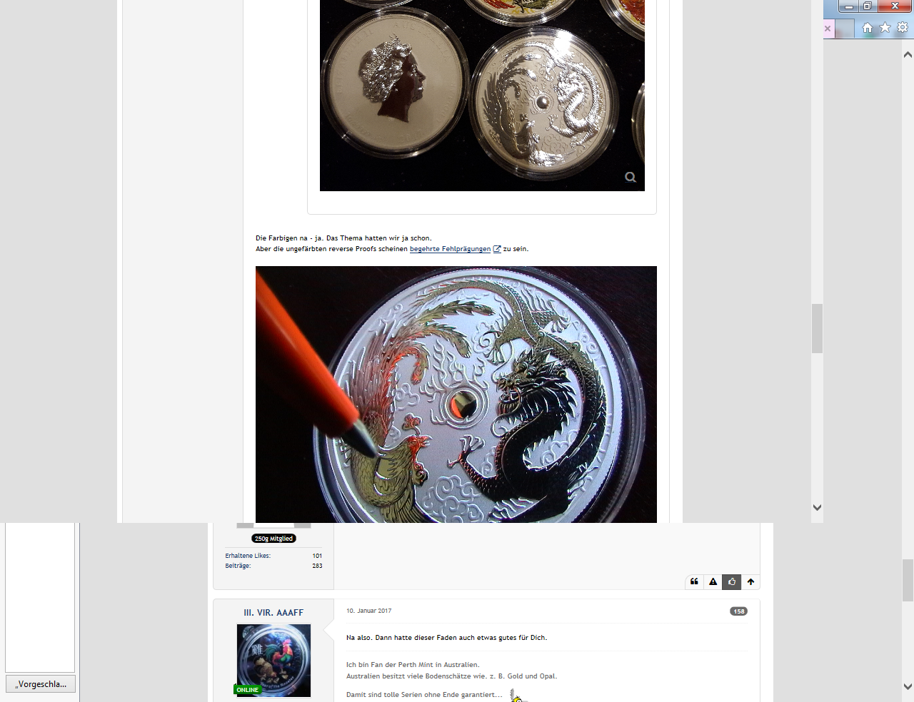 Also ich hätte die Auktion an Stelle des von Dir verlinkten eBayers nicht gelöscht, auch wenn es peinlich scheint, wenn Du hier fast schon im Halbstundentakt die Dragon and Phoenix Münzen schlecht redest.