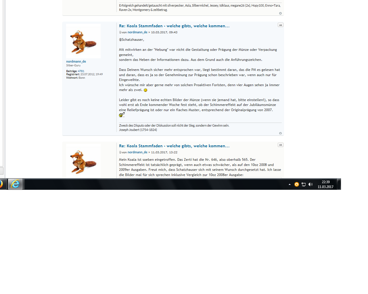Bild: von links nach rechts - 1kg Lunar II Maus, Koala 2009 ohne Schimmereffekt und unten Koala 2008 mit SchimmereffektDas bestreitet auch der Koala Experte Normann nicht. Hat er sich doch gestern auf der Seite des Betreibers des Preisvergleiches wörtlich wie folgt zu der 10 oz Silber Koala 2017 Jubi Ausgabe geäußert: