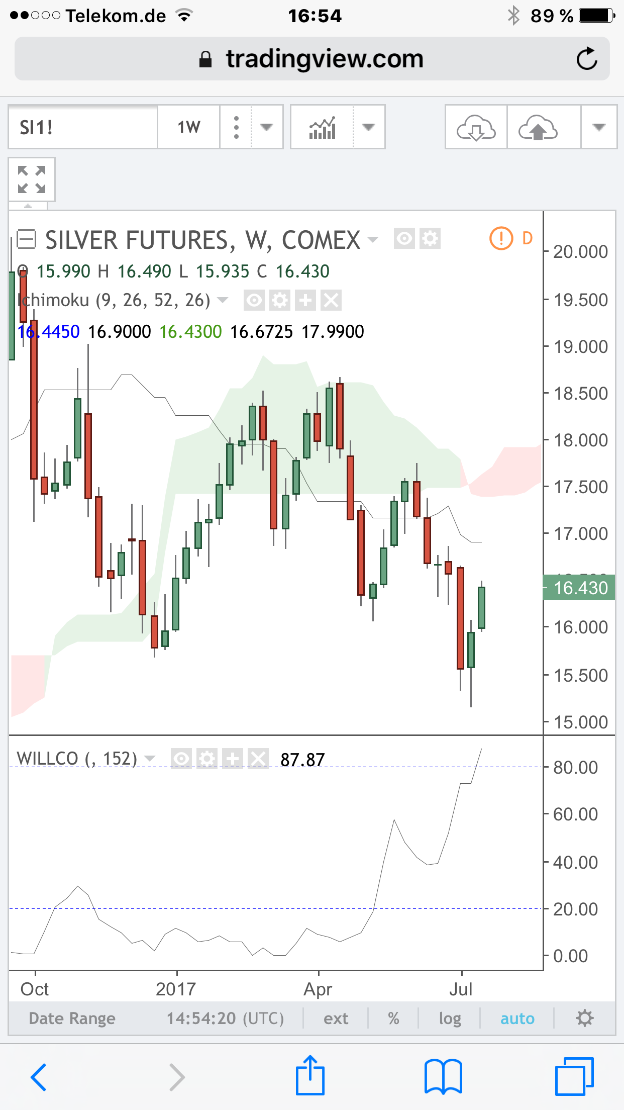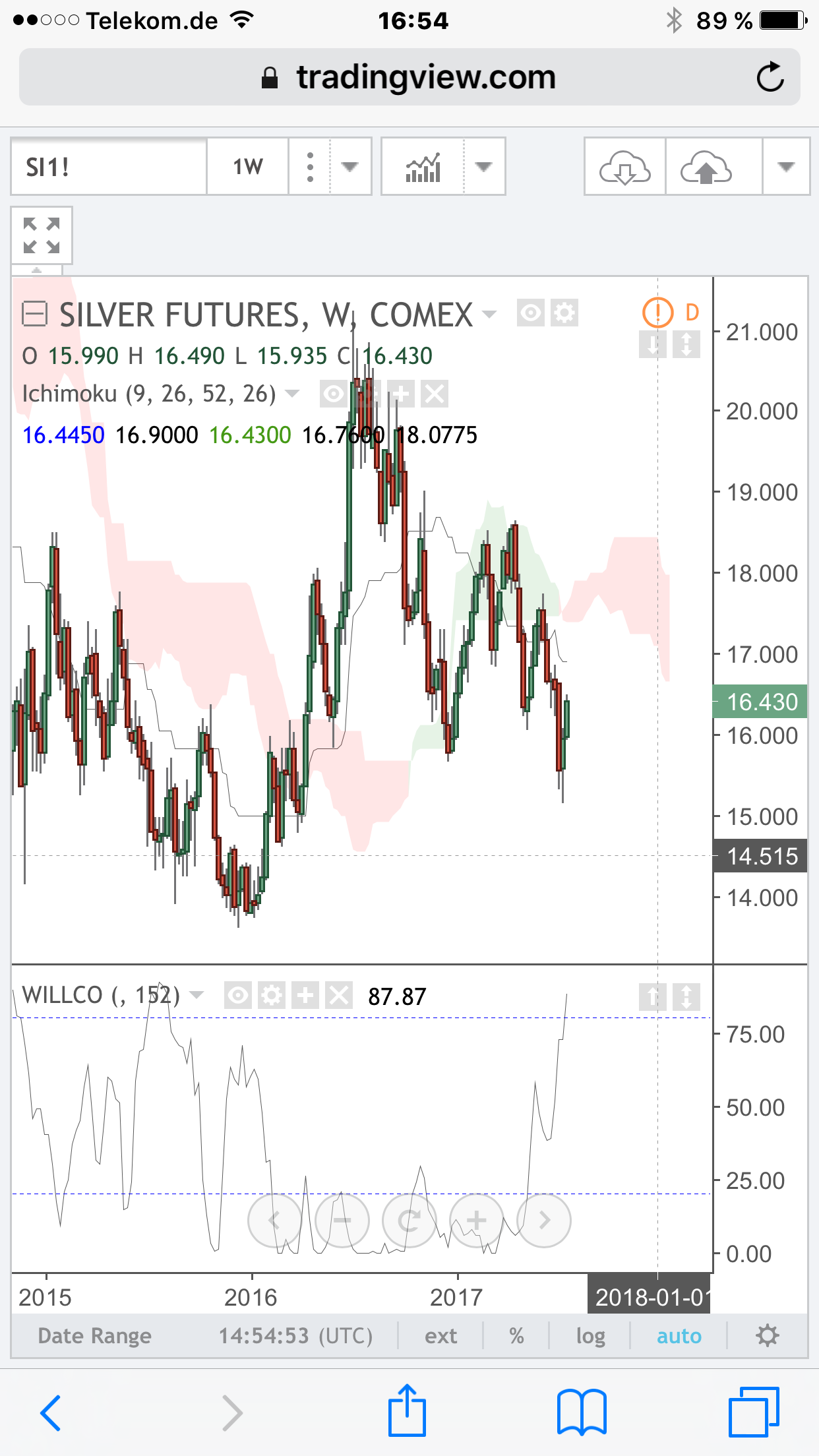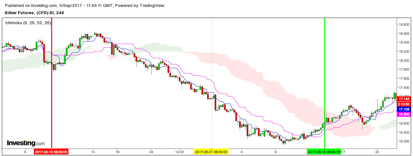 über Investing.com lasse ich dann den Silber-Future auf 4 Stunden Basis mit dem IKH laufen, s. Bild.