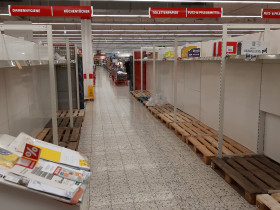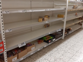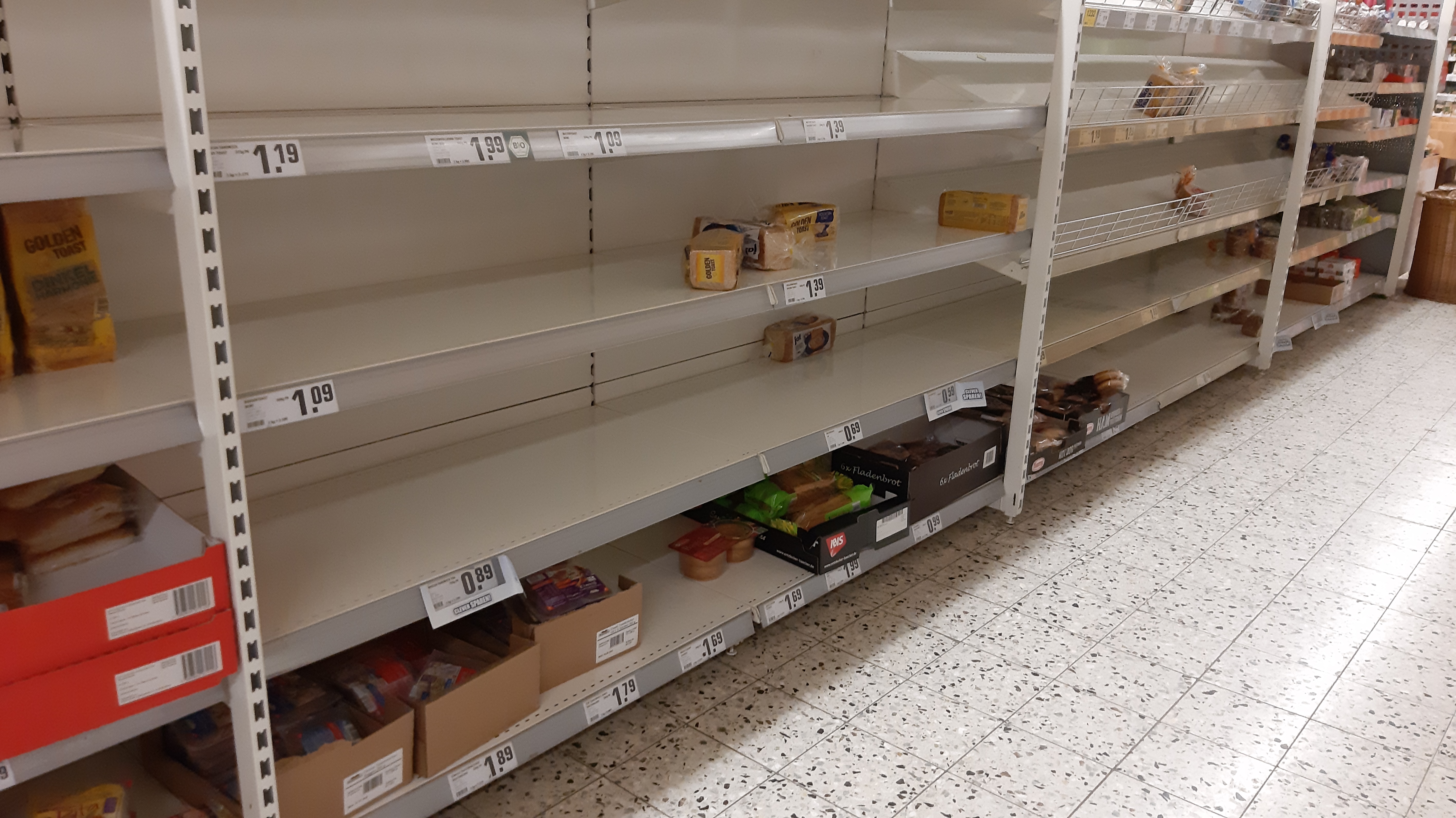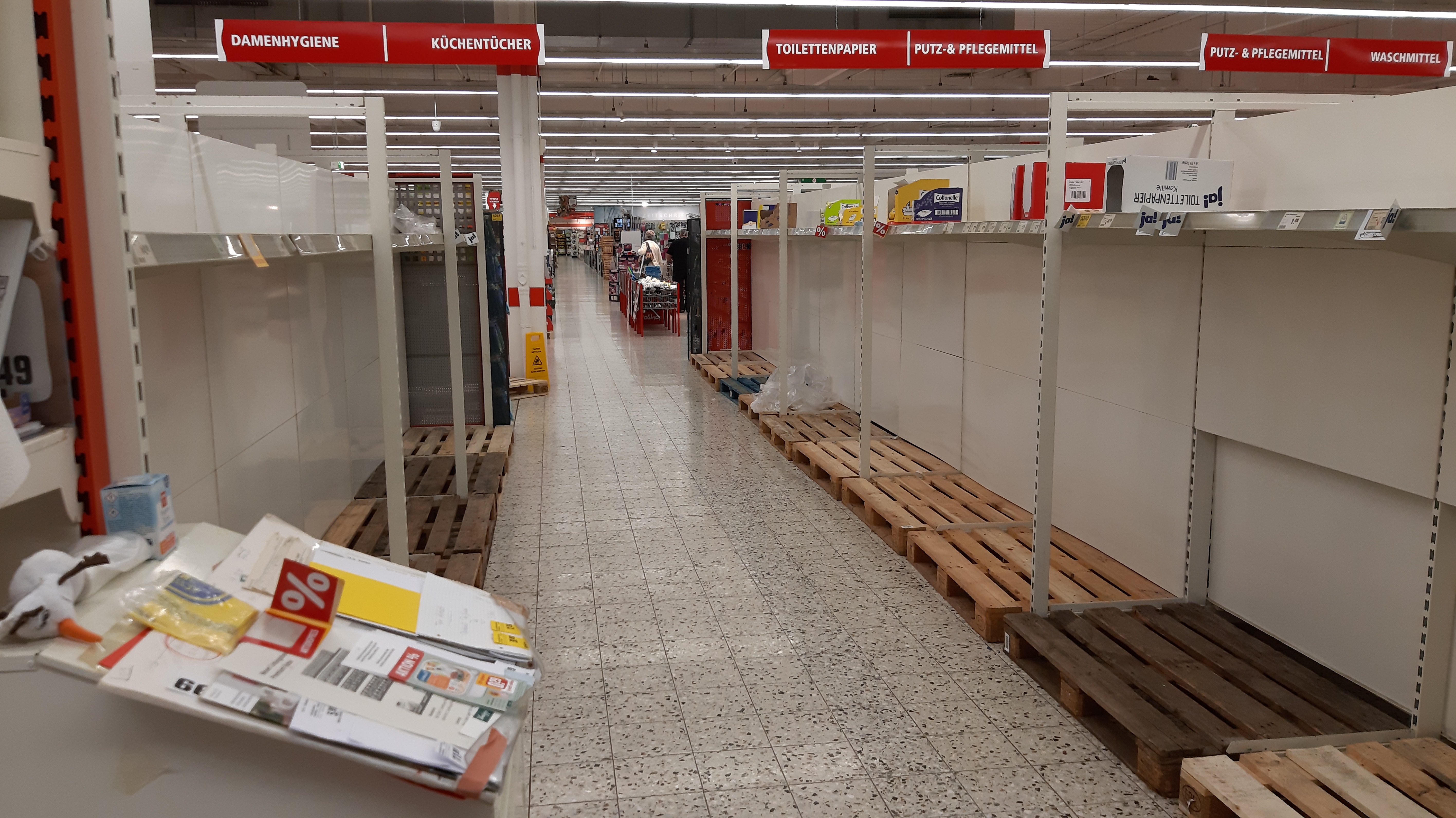 Hier scheint der große Schwall schon durchgeflogen zu sein: Keine einzige Milch, kein Klopapier, keine Küchenrolle, keine Tempos mehr. Brotbelag halb leer, Mitarbeiter hektisch am nachfüllen und es wurden auch Aushilfen herumdirigiert.Und das Radio hatte Recht: Es ist genug für alle da, mehr als genug - und zwar bei mir im Keller