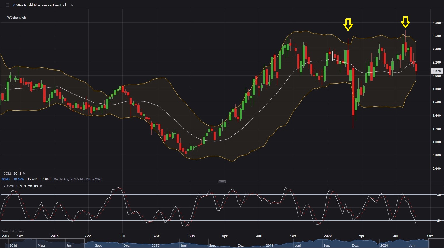 WGX hat auch in 2019 schon einen recht ordentlichen Run hingelegt und befindet sich seitdem in der Konsolidierungsphase. Nach zwei gescheiterten Ausbruchversuchen auf Wochenbasis laufen wir gerade wieder in eine starke Unterstützungszone bei ca. 2 AUD, die lediglich beim Coronatief gerissen wurde. Ich denke wenn beim nächsten Anstieg endlich der Deckel bei 2,50 - 2,60 AUD wegfliegt geht auch hier wieder die Post ab. Zu den guten fundamentalen Daten (vielen Dank an alle hier für die Infos