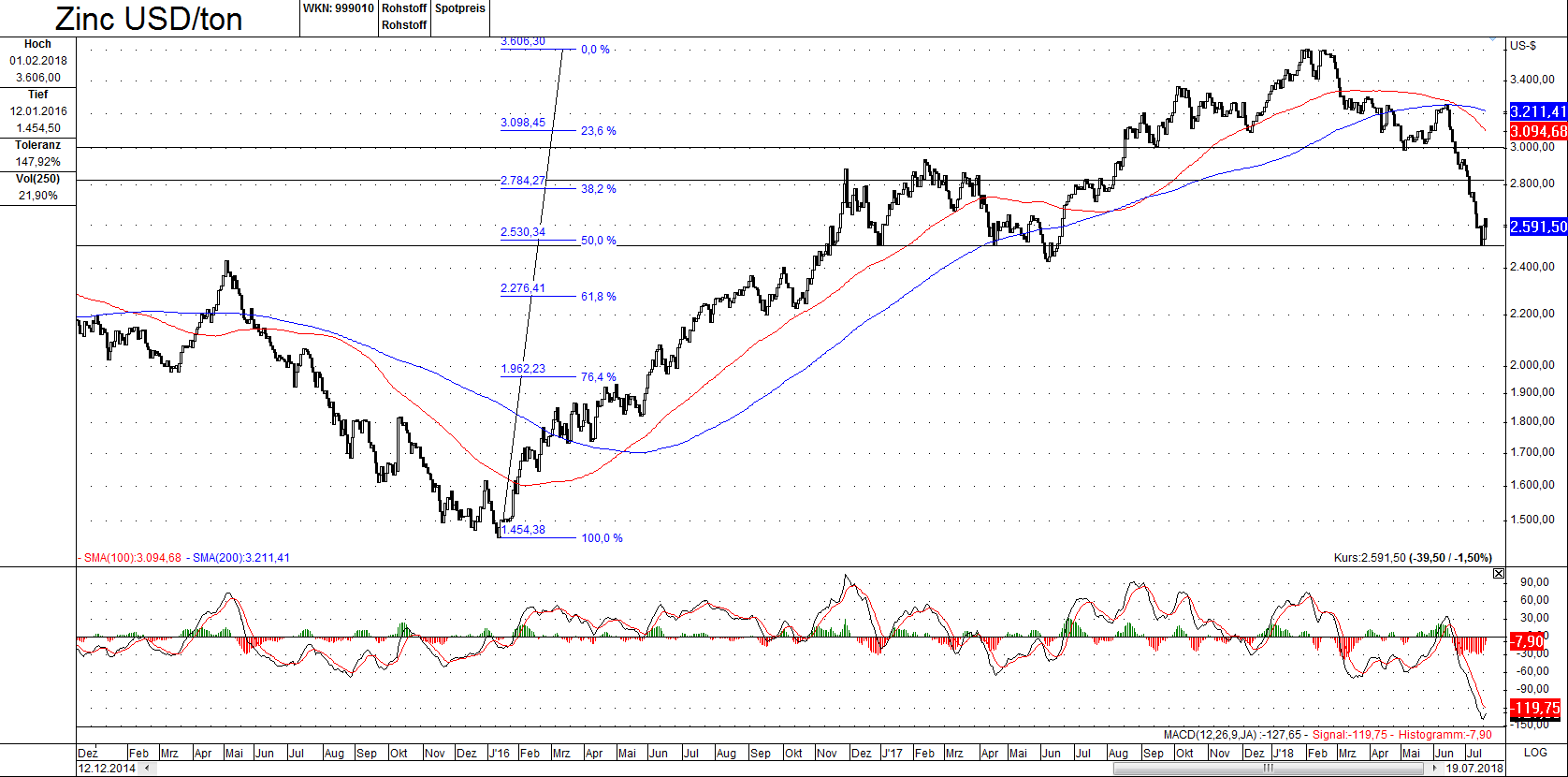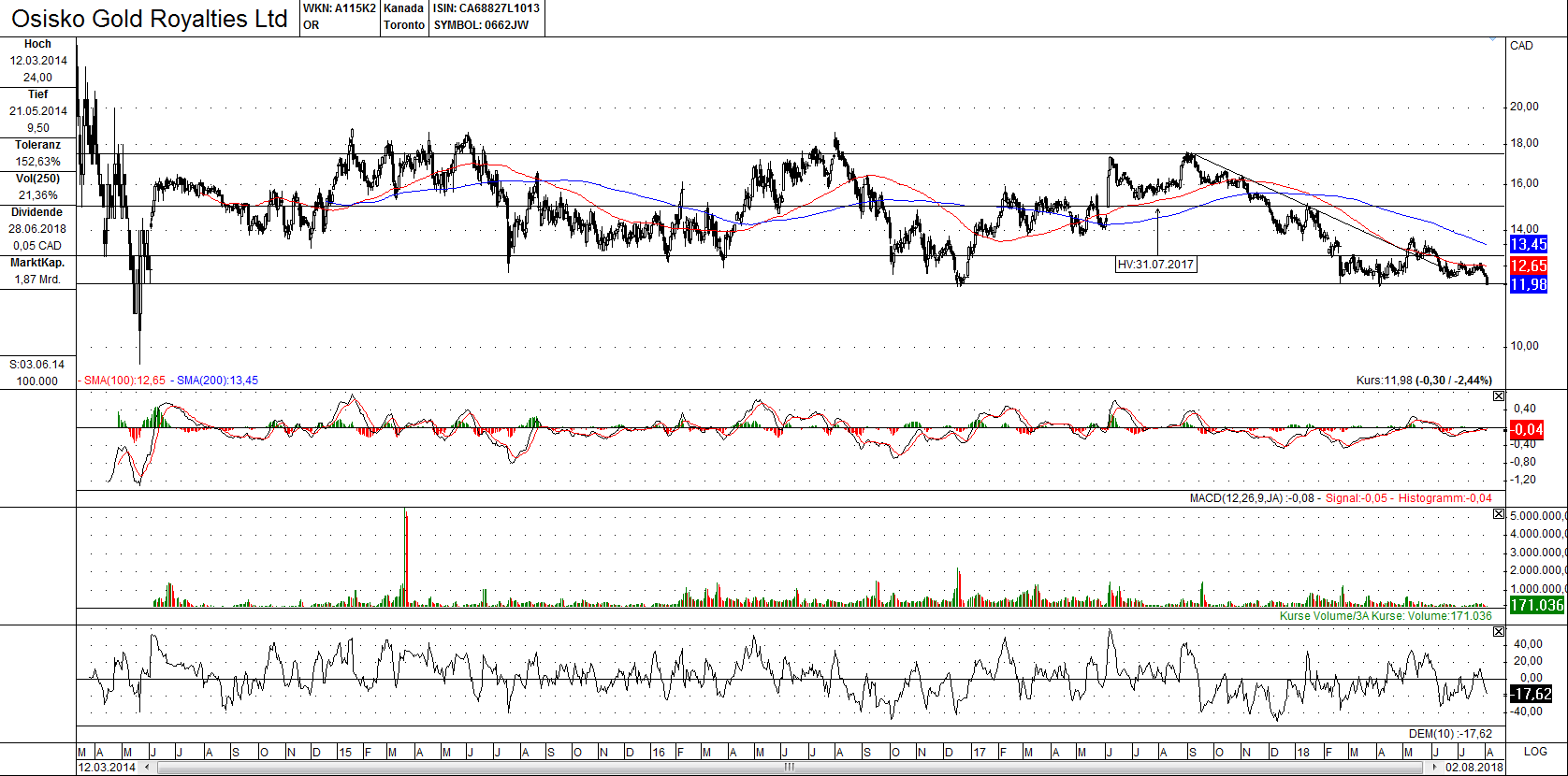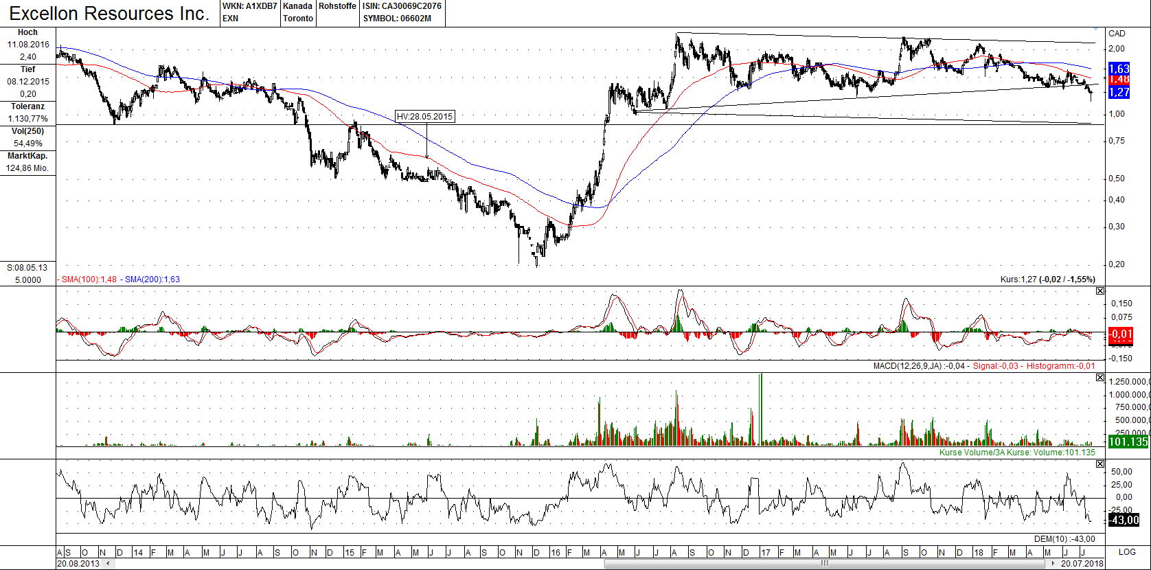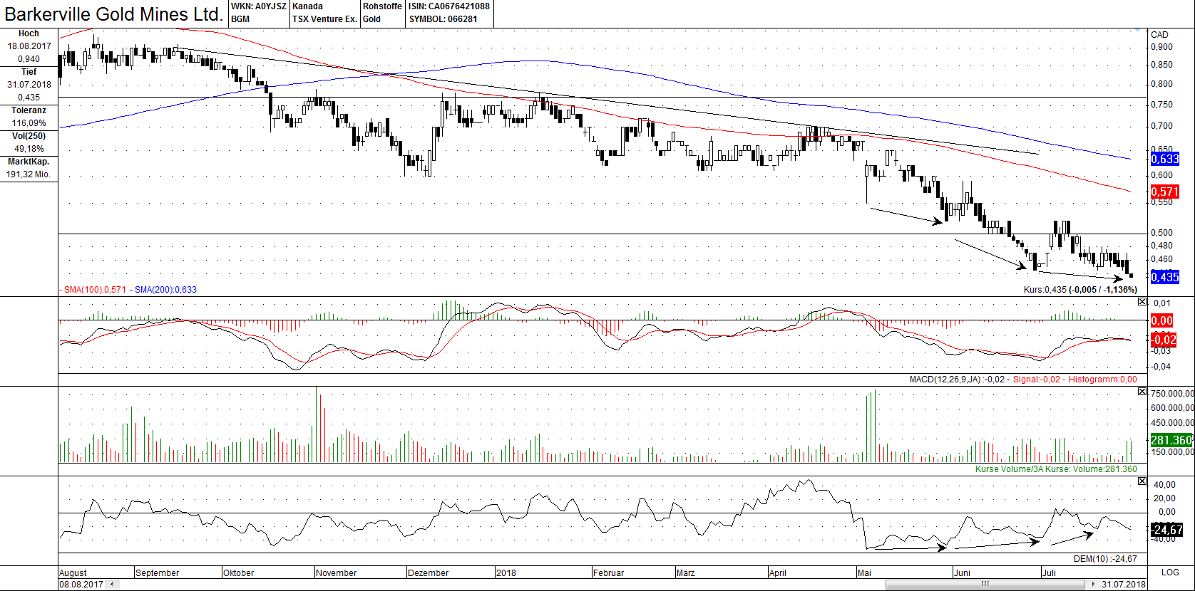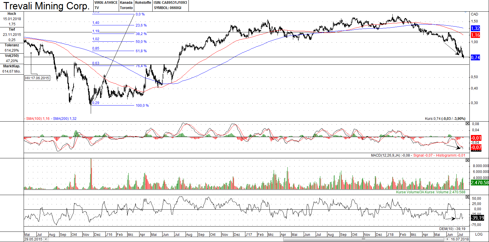 Wenn die Bewegung seit Ende 2017 korrigiert wird, dann liegt das 62%-Retracement bei 3,61C$. Die Bewegung heute sieht fast wie ein Hammer aus, ist aber keiner.