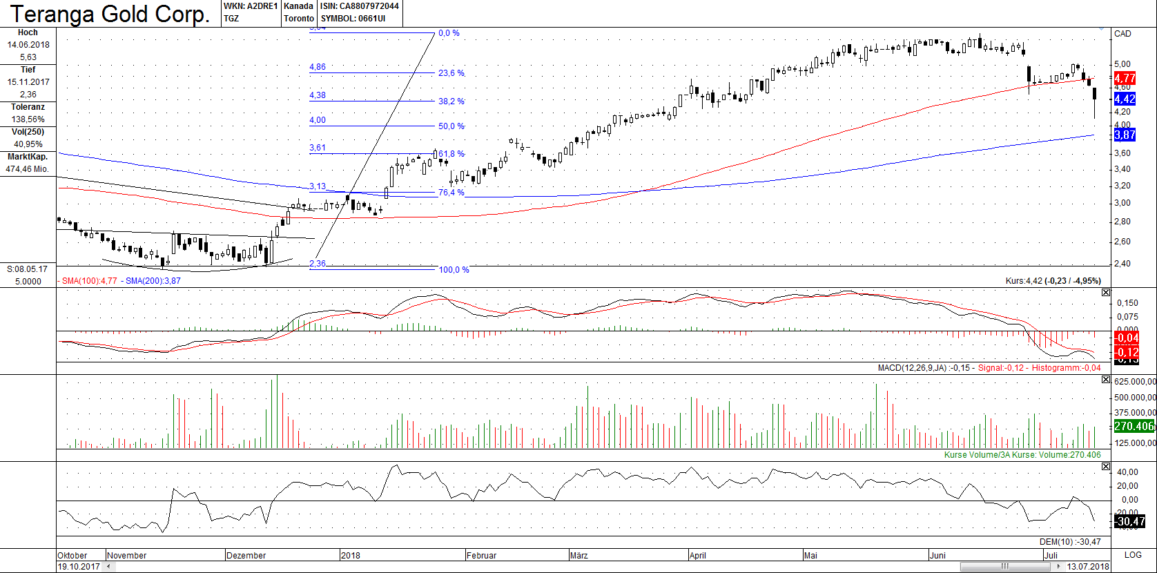 Wenn die Bewegung seit Ende 2017 korrigiert wird, dann liegt das 62%-Retracement bei 3,61C$. Die Bewegung heute sieht fast wie ein Hammer aus, ist aber keiner.