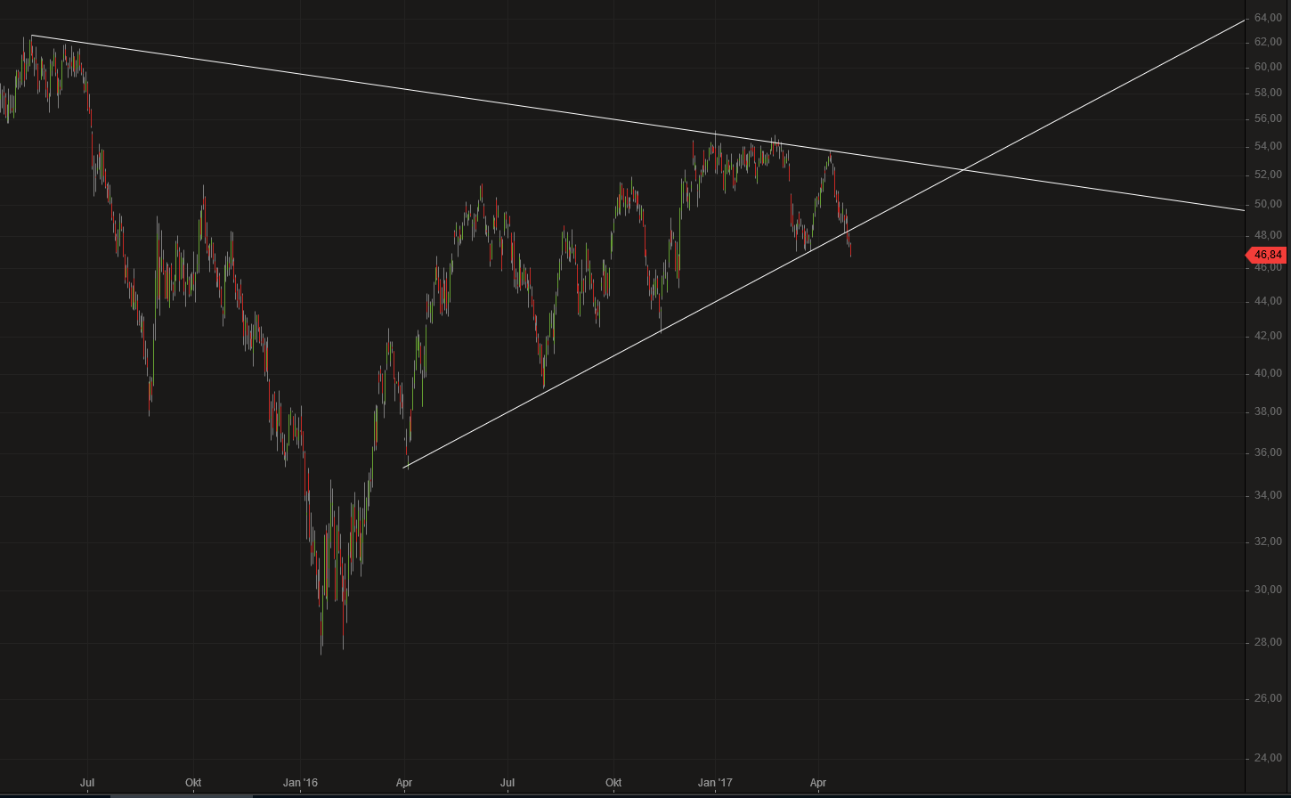 Gleichzeitig ein Doppelhoch und noch den Aufwärtstrend seit Januar 2016 gebrochen.Somit wird, wie ich vermutet habe, das sehr große Dreieck nach unten aufgelöst, meist wird es in der Richtung des dominierenden Trends aufgelöst und das ist der schon mehr als fünf Jahre dauernde Abwärtstrend.