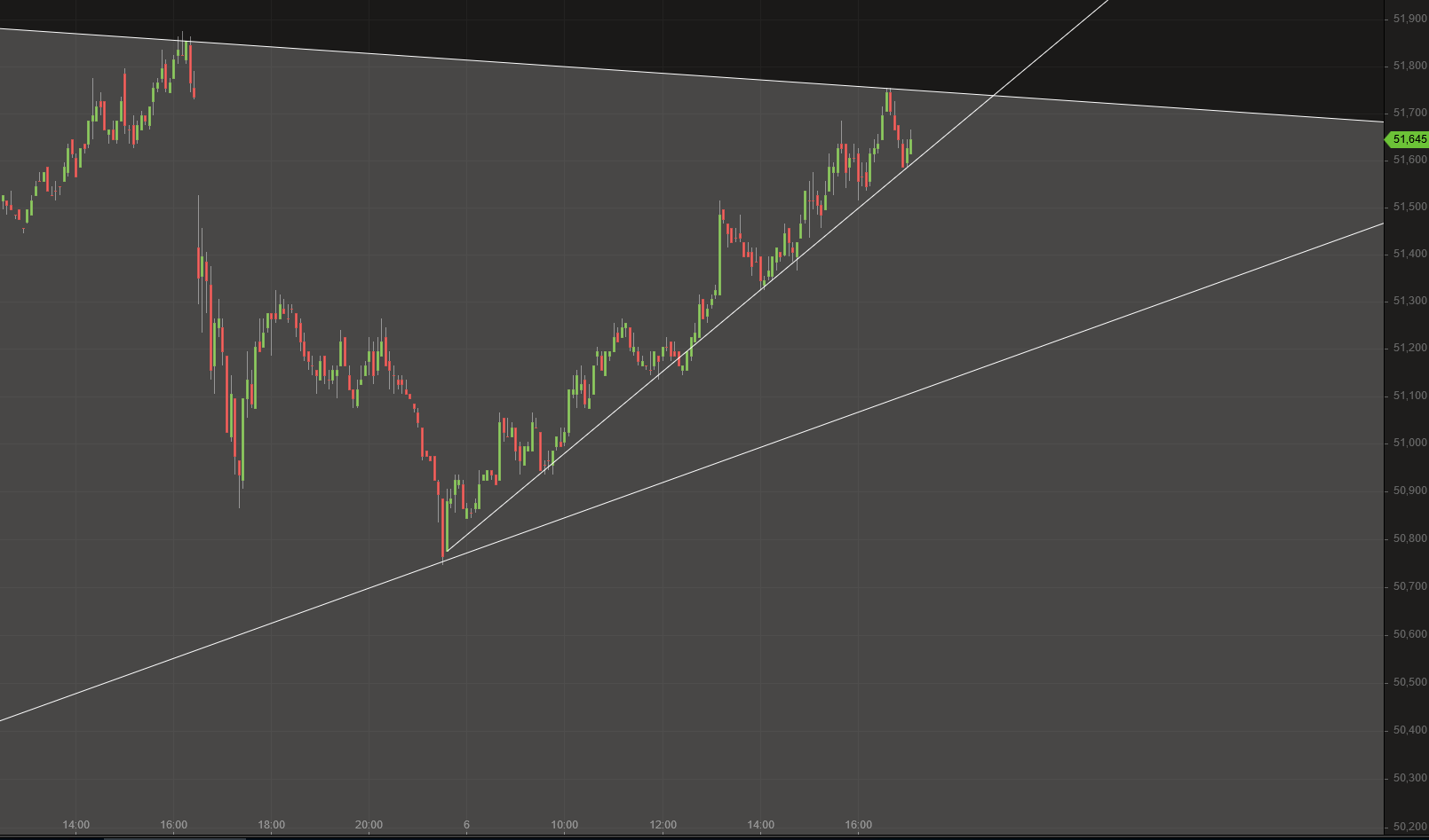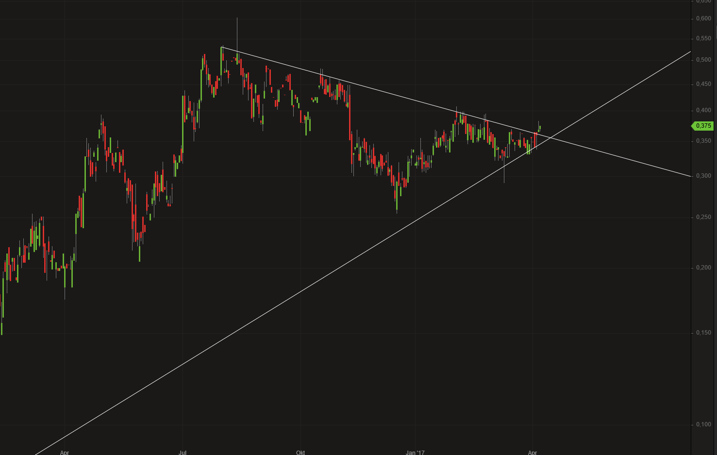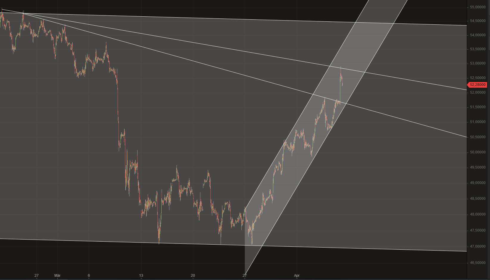 Also ich warte jetzt erstmal ab, ob es das Hoch heute Nacht gewesen ist. Alternativ kann es durchaus nochmal die 54,5$ anlaufen, bis es an die übergeordnete Abwärtstrendlinie prallt.